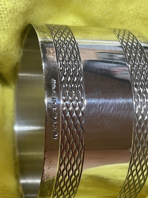 Beautiful set of 6 vintage English silver napkin rings. Each have a simplistic but well crafted wrapped design, The hallmarks are quite worn, so I’ve been unable to establish detail of the assay or maker marks, you may be able to investigate this with higher grade magnification. Pictures are attached with the marks which are the best i could manage with my camera. Width 42mm, height 26mm, weight 28-30 grammes each. Complete with box, which is in poor state of repair.