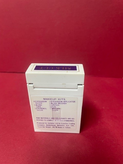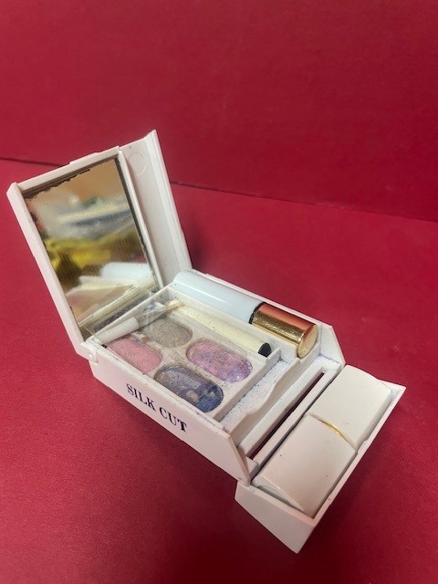 Silk Cut promotional mascara set, in the style and exact dimensions of a cigarette box. All intact with 4x eye shadow, eye shadow applicator, blush, blush brusher, lipstick, mascara and eye pencil. Complete with small mirror. Listed as used, but very little/no signs of actual use. A very rare collectible!